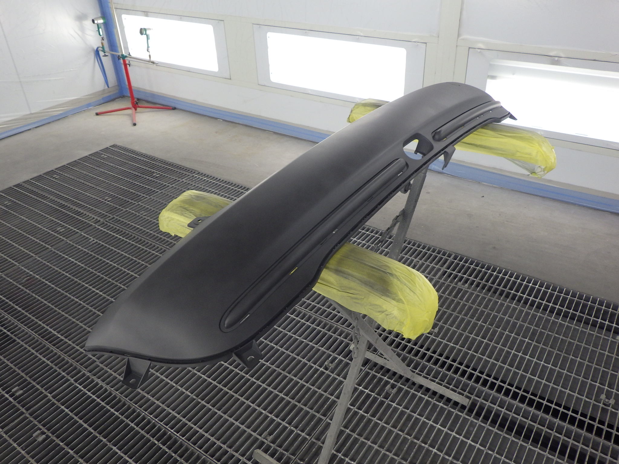 乾燥後、足付け作業、マスキング作業、脱脂作業、エアブローを行い、